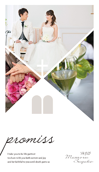 【使用写真枚数…3枚】 教会をモチーフに写真をレイアウトしたシンプルでありながら個性的なデザイン。どんな写真も良く合います。英文は「病めるときも健やかなるときもあなたと共に歩んでいきます」という誓いの言葉です。お二人のお名前と記念日をお入れします。 宛名面のメッセージは自由に変更できますので、定型文でなくオリジナルの文章をご希望の方はご注文フォームにご記入ください。